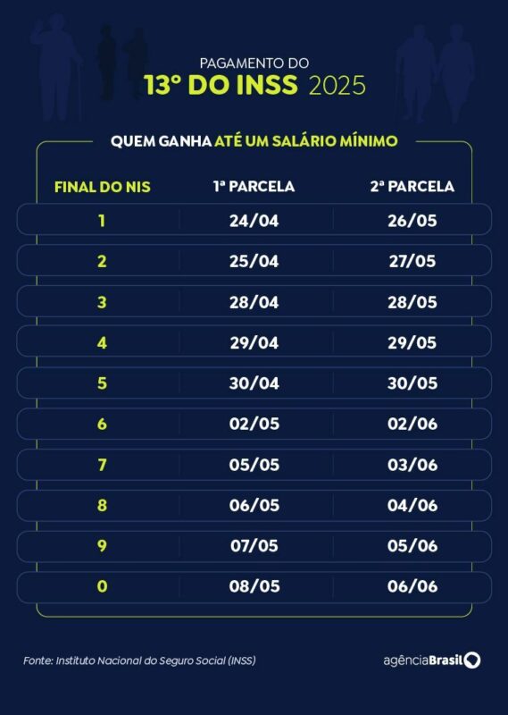 O pagamento de 50% da gratificação será feito junto com o benefício de abril, com calendário previsto entre 24 de abril e 8 de maio. A segunda parcela virá no mês seguinte, de 26 de maio a 6 de junho, acompanhando o cronograma regular de pagamentos.